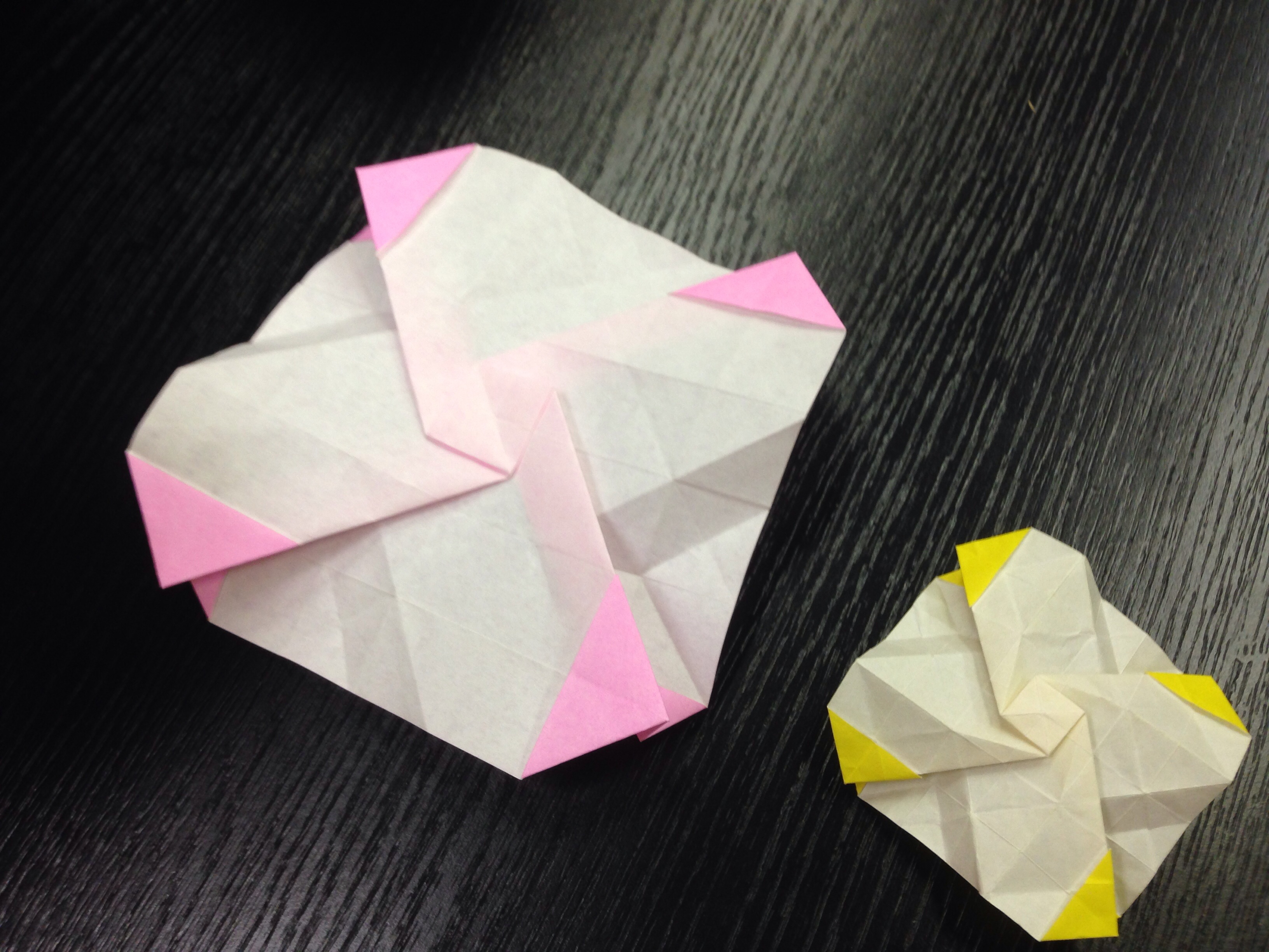 Hさんがこのブログをいつも熱心にご覧くださっていて、「あのバラ…素敵ですねぇ。紙によって表情が違って…あの、ハイ⚪︎ュウの包み紙とか…ウフフ」とおっしゃるので、「折りますか?」…そんなわけで、福山ローズ講習会です。